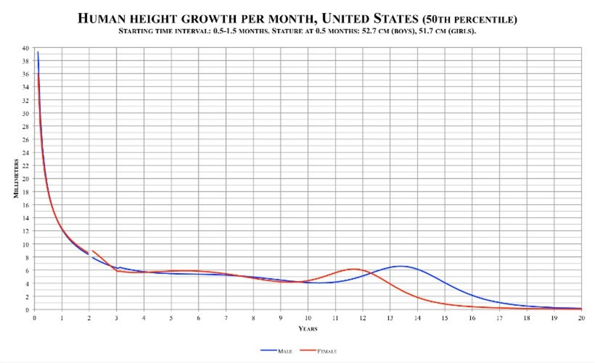 Ακόμα και με υγιεινή διατροφή, το ύψος των περισσότερων ανθρώπων δεν θα αυξηθεί μετά την ηλικία 18 έως 20 ετών. Το παρακάτω γράφημα δείχνει τον ρυθμό ανάπτυξης από τη γέννηση έως την ηλικία των 20 ετών. Όπως βλέπετε, οι γραμμές ανάπτυξης μειώνονται στο μηδέν μεταξύ 18 και 20 ετών.